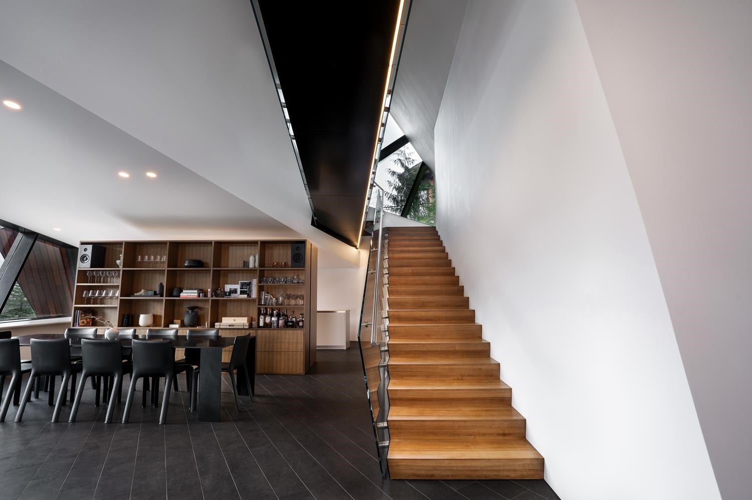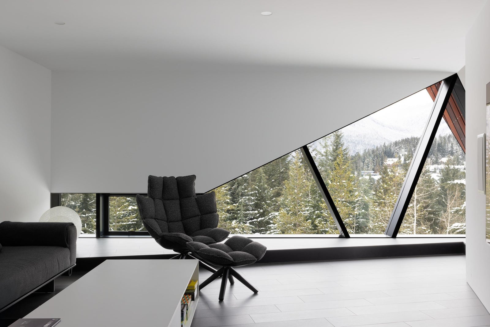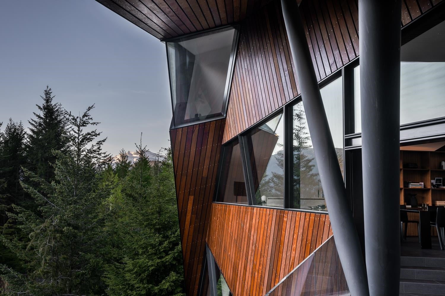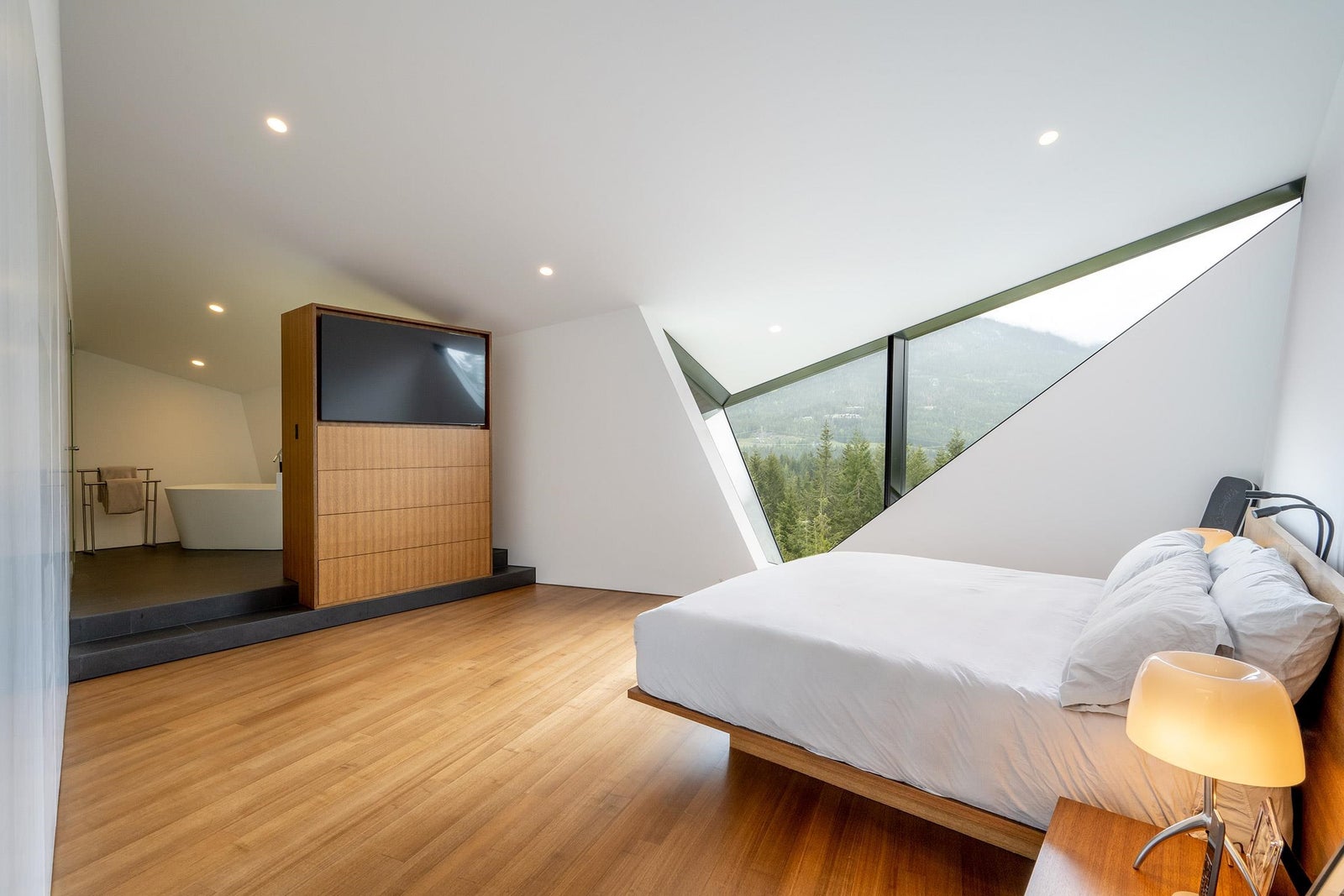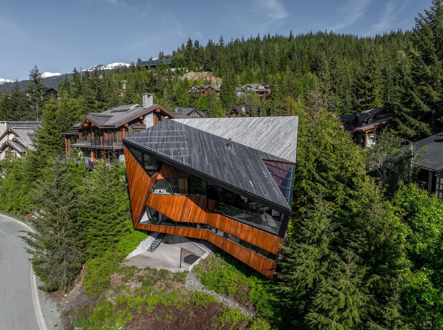 There are notable homes in Whistler, and then there’s 3801 Sunridge Place. Designed by Patkau Architects, this is a piece of art you can live in — a modern mountain hideaway that doesn’t just sit on the hillside, it folds into it. Anchored at the end of a quiet cul-de-sac in Sunridge Plateau, Whistler’s most prestigious ski-in/ski-out enclave, this home was built to frame every valley view, every snowfall, every last golden hour. Inside, 4,497 square feet of light and angles unfold in sharp lines and warm finishes. White walls reflect the sun as it moves through oversized windows. Ceilings lean and walls dip — like origami in motion — creating a flow that’s anything but standard. Wrapped in Ipê hardwood that naturally fades to silver with time, the house blends into its surroundings.